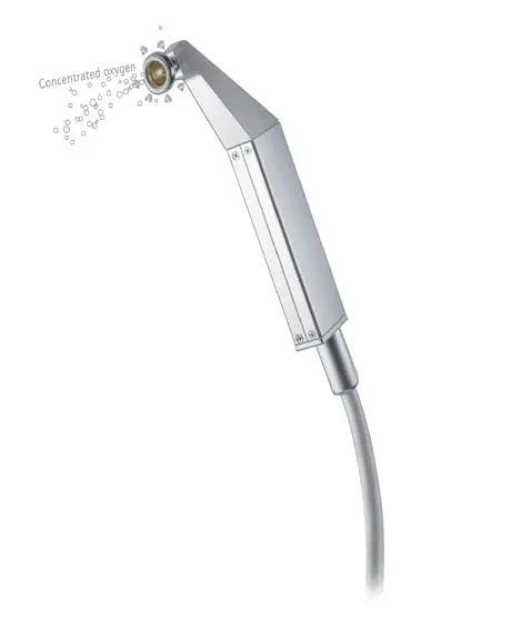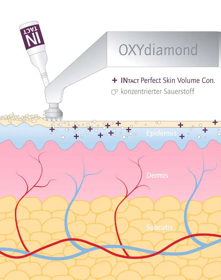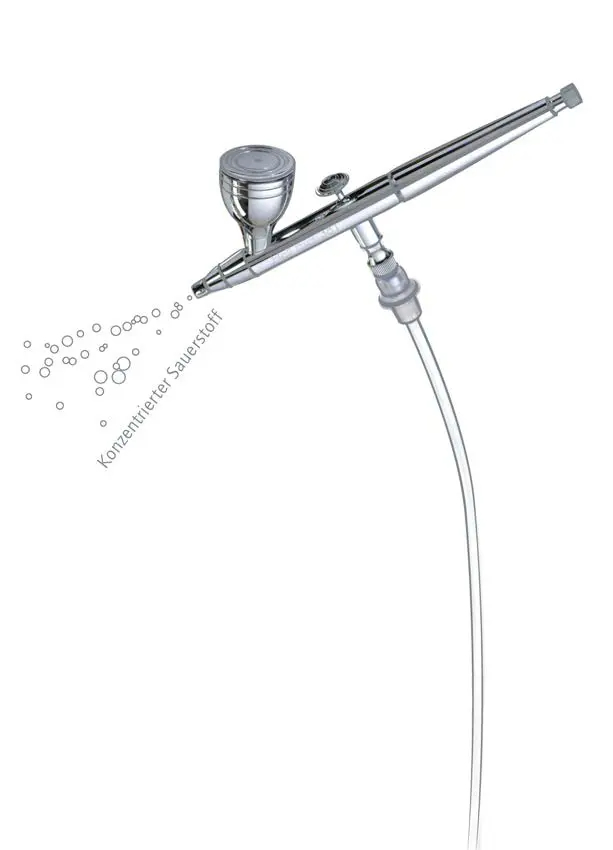 The NORA BODE OXYJET safe oxygen pressure injection system is used to inject special cosmetic preparations directly into the target areas of the skin. The skin is entered through natural spaces in the epidermal cells (the organic matrix) and preparations are deposited in deeper layers of skin where they have desired effect.