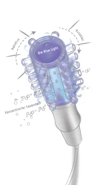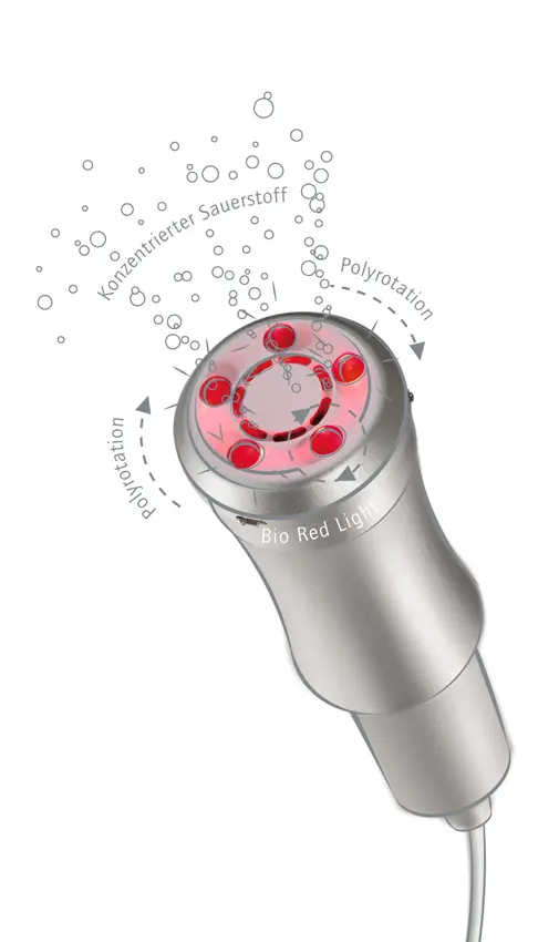 Pure concentrated oxygen, the specially formed applicator for arms and legs, and Bio Blue/ Red Light help improve the lymphatic flow – allowing smoother skin appearance.